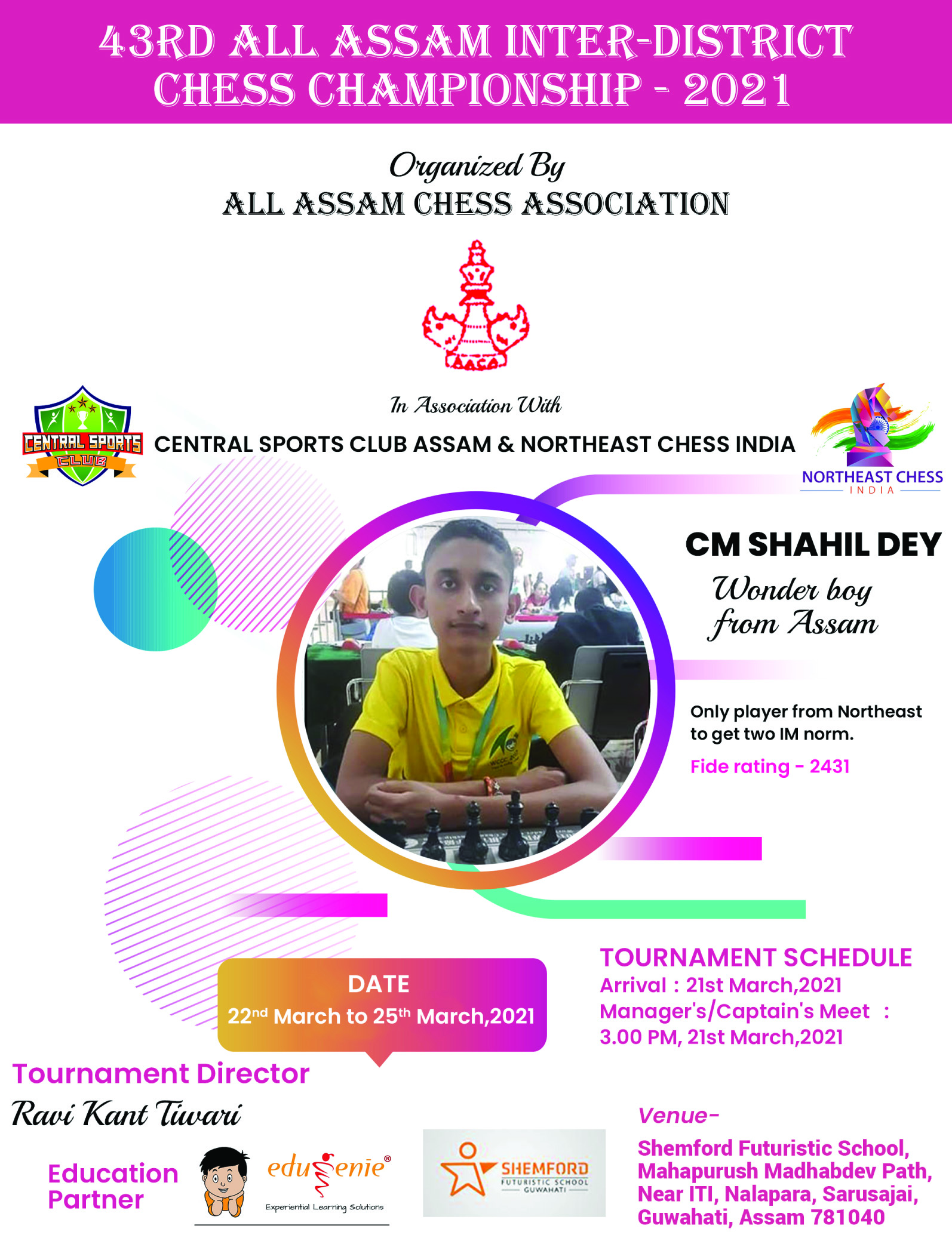All Assam Inter District Chess Championship (Senior)-2021 is Going to be held from 22nd to 25th March,2021 at Shemford Futuristic School Guwahati, Mahapurush Madhabdev Path, Near ITI, Nalapara, Sarusajai, Guwahati, Assam by All Assam Chess Association in cooperation with Central Sport Club of India and North East Chess India. From this tournament Assam Team to participate in Senior National Chess Championship 2021 to be held in Kanpur from 13th to 20th April,2021 will be selected.
