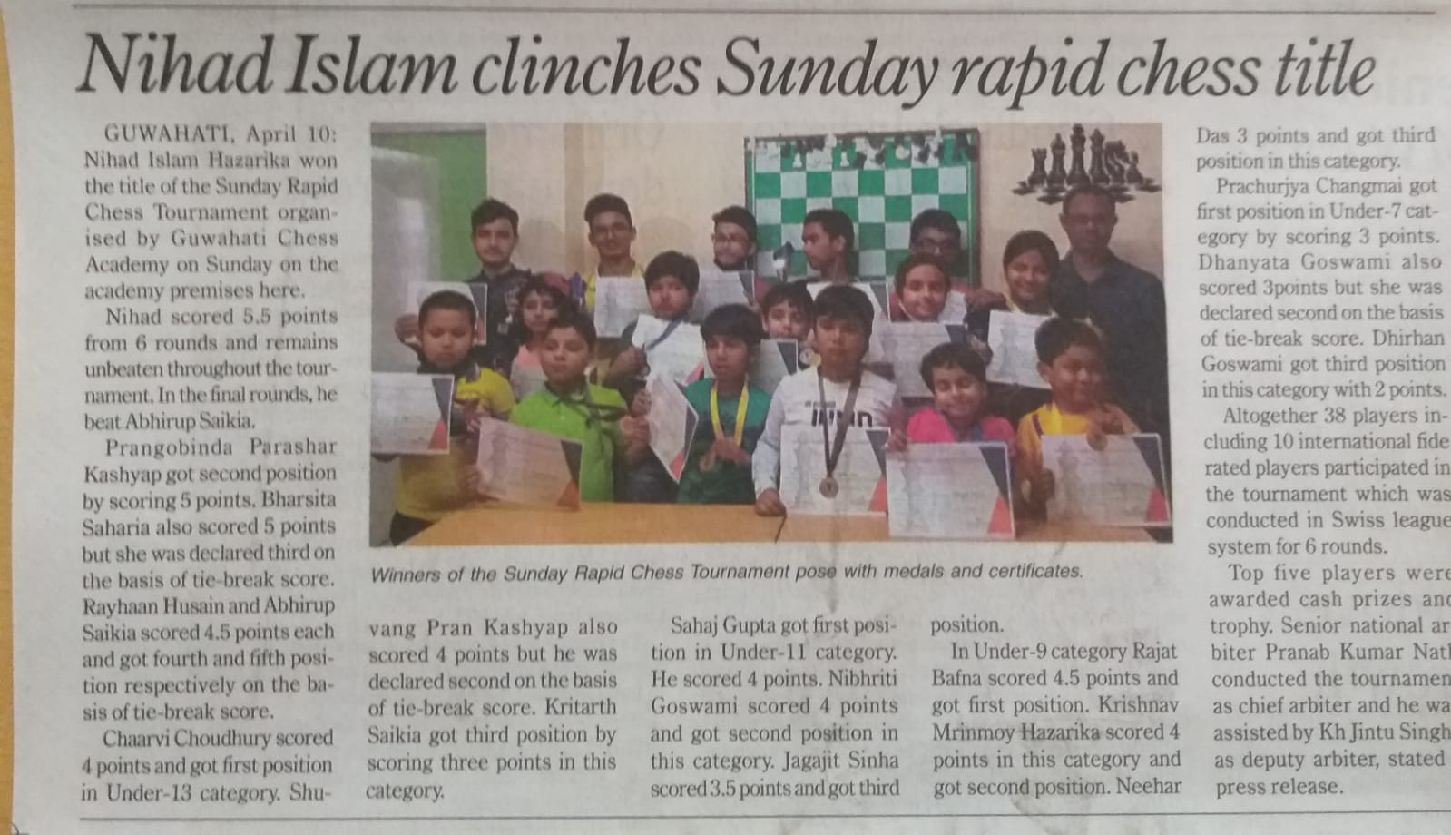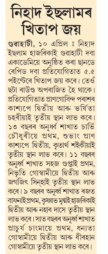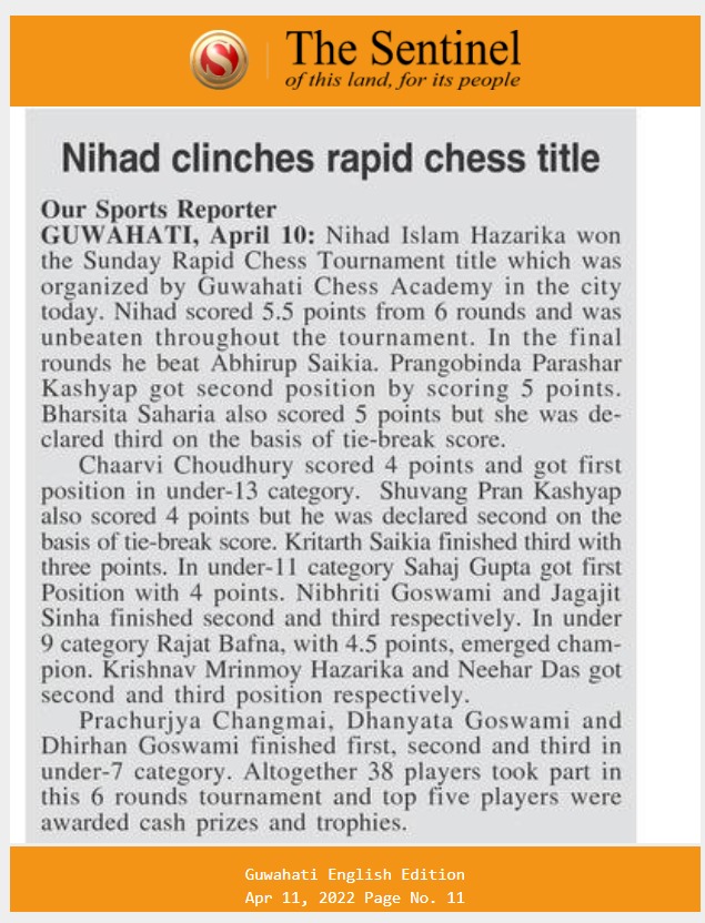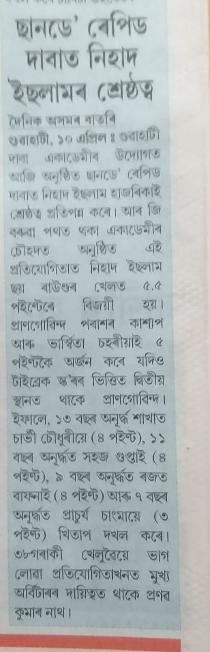 Nihad Islam Hazarika Clinched The Title in Sunday Rapid Chess Tournament. The Tournament was organized by Guwahati Chess Academy on 10th April, 2022 at Academy Premises in R G Baruah Road, Guwahati, Altogether 38 players including 10 International Rated Players participated in the tournament. The Tournament was held in swiss league system for 6 rounds. Top five position holders were awarded cash prizes. Pranab Kumar Nath conducted the tournament as Chief Arbiter and he was ably assisted by Kh Jintu Singh as deputy Arbiter.