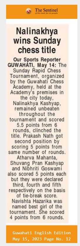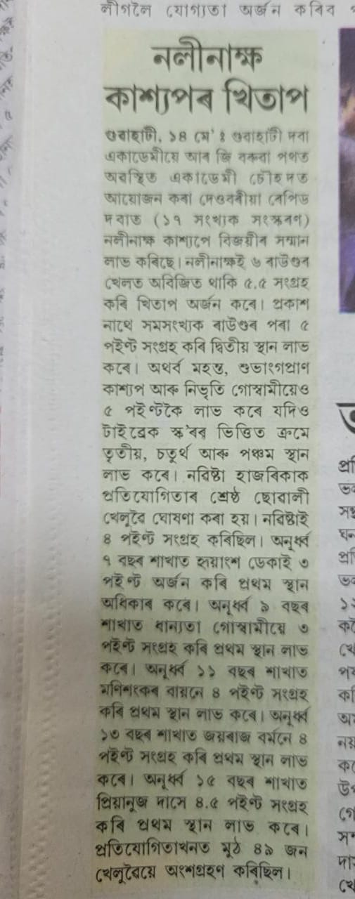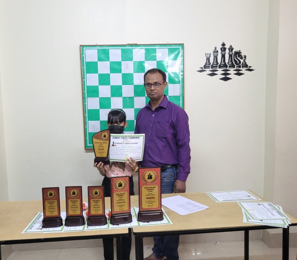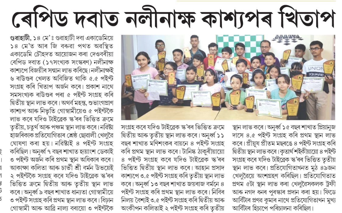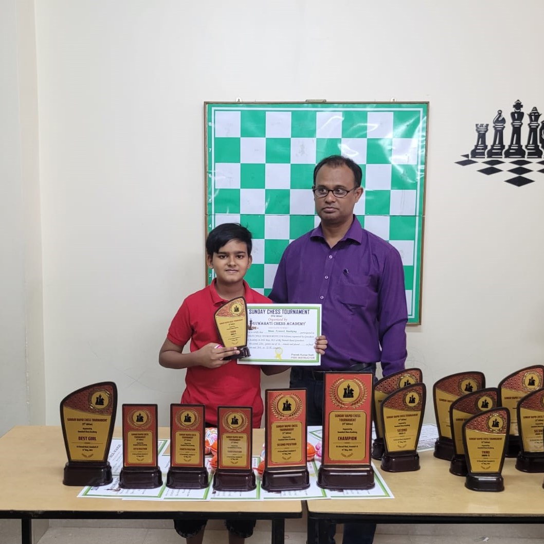 Guwahati Chess Academy hosted the 17th Edition of the Sunday Rapid Chess Tournament on May 14, 2023, at Academy premises on R G Baruah Road in Guwahati. In an impressive display of skill and determination, Nalinakhya Kashyap emerged as the deserving champion. With an exceptional performance, Kashyap scored an impressive 5.5 points out of 6 rounds, remaining undefeated throughout the entire tournament.