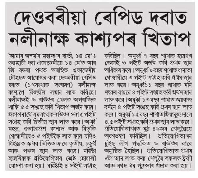 Jayraj Barman scored 4 points and got first position in under-13 category. Nibir Nilay Baishya scored 3.5 points and got second position. Ankipan Kalita scored 2 points and got third position in this category.